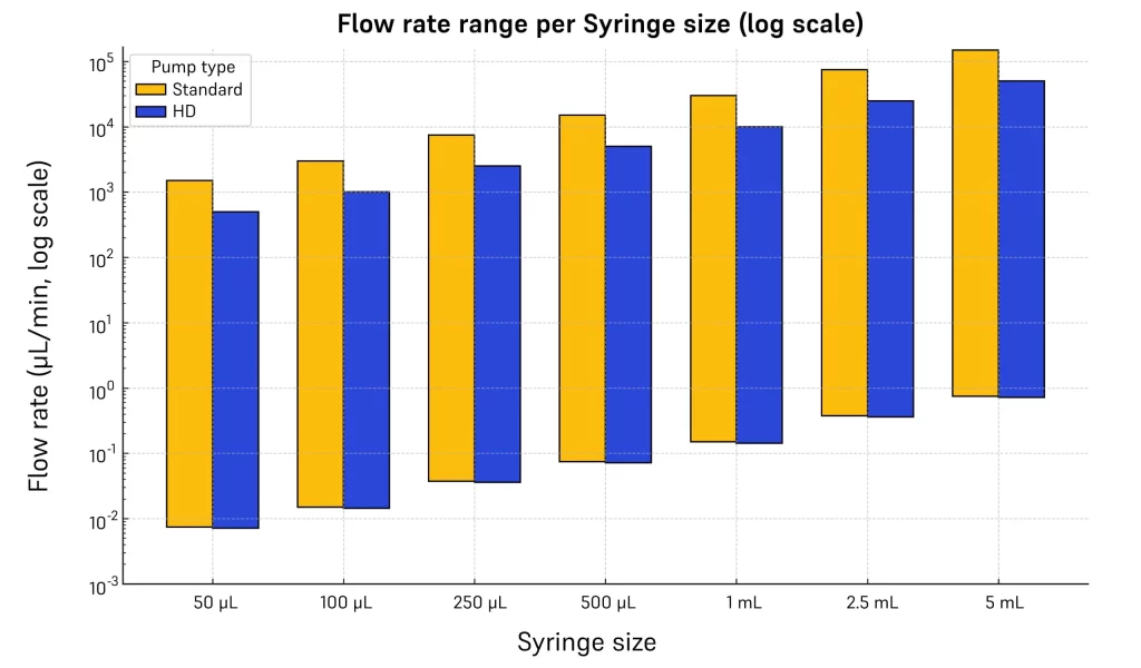 On the other hand, the Standard model supports faster operation, reaching flow rates up to 150 mL/min with a 5 mL syringe. The HD version, optimized for control rather than speed, has a maximum flow rate of 50 mL/min.